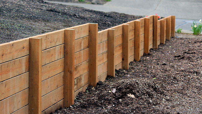 Site cuts, soil removal, retaining walls (timber & concrete), plants, turf, mulch and rock walls.